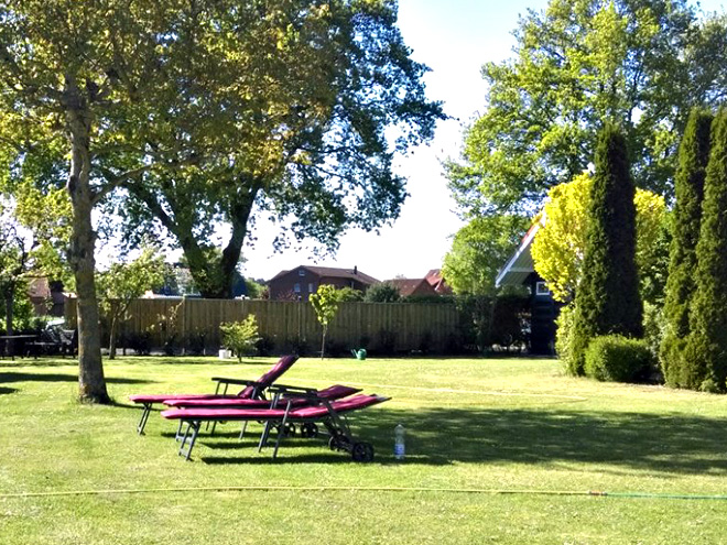 Der großzügige Gartenbereich bietet Sitzgruppen und Sonnenliegen zum gemütlichen Verweilen.